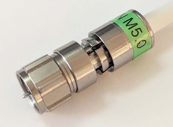 F-Kompressions-Stecker für KoaxialKabel, passend für LCD 89 und Koaxialkabel mit 4,9-5,4 mmMantel und 3,6-4,4 mm Außenleiter, mit O-Ring und Push-PIN Innenleiter, Schirmungsmass typ. 90 dB, Schirmklasse A
