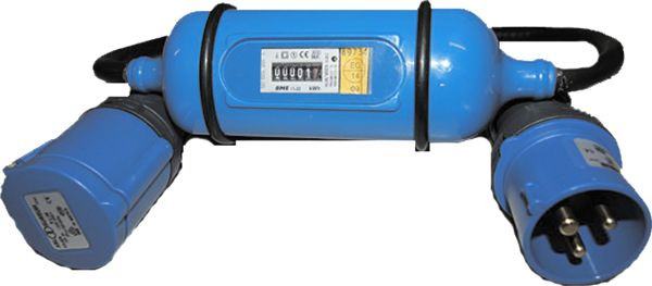 eingegossen in schlagfestes, gegen Wasser abgedichtetes Kunststoffgehäuse, mit elektronischem Wechselstromzähler 5(25)A, 230V, 50Hz, geeicht, mit PTB-Zulassung, mit CEE-Stecker und CEE-Kupplung 16A 230V/6h