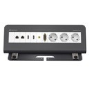 Design Tischanschlussfeld zum;Anklemmen an die Tischplatte, 6-fach;Gehäuse, pulverbeschichtet RAL 7015;schiefergrau, bestückt mit 3 x Strom,;HDMI, VGA (HD15), Audio Klinke, USB;2.0 Typ A, 2 x Cat-6 (Bu/St, Kabel-;peitsche 1 m), Netzleitung GST18 1 m