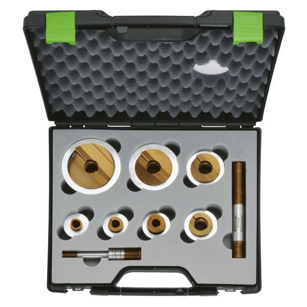 beinhaltet Stempel und Matrizen inklusive der Zugbolzen, komplett im Kunststoffkoffer Einzigartiges Stempelprofil, Stanzabfall-Stücke werden gespalten und können leicht entfernt werden. Geeignet für Edelstahl (V2A), Stahlblech (St37), Kunststoff und Aluminium. Betätigung hydraulisch. Lieferumfang: SLUG-SPLITTER Spalt-Blechlocher (Edelstahl) 16,2 mm (50069527), SLUG-SPLITTER Spalt-Blechlocher (Edelstahl) 20,4 mm (50069543), SLUG-SPLITTER Spalt-Blechlocher (Edelstahl) 25,4 mm (50069560), SLUG-SPLITTER Spalt-Blechlocher (Edelstahl) 32,5 mm (50069594), SLUG-SPLITTER Spalt-Blechlocher (Edelstahl) 40,5 mm (50069616), SLUG-SPLITTER Spalt-Blechlocher (Edelstahl) 50,8 mm (50069632), SLUG-SPLITTER Spalt-Blechlocher (Edelstahl) 64 mm (50069667), Zugbolzen für hydraulische Betätigung Durchmesser 11,1 auf Durchmesser 19 mm, 108 mm (50294512), Zugbolzen für hydraulische Betätigung Durchmesser 19 x 140 mm (50294520), Kunststoffkoffer (KKISO16B63).