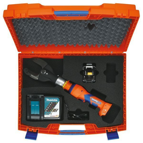 VDE-Akkuhydraulisches Schneidwerkzeug Durchmesser 50 mm für Kupfer- und Aluminiumkabel (auch feindrähtig). Sehr hohe Schneidkapazität dank innovativer Schneidengeometrie. Alle Werkzeugdaten im Blick dank Display und ipress App, Akku-System: Makita, einfaches Auslesen aller Daten mittels Bluetooth, offener Kopf, drehbar, einfach und sicher: Ein-Knopf-Bedienkonzept zur Steuerung aller Werkzeugfunktionen, ermüdungsfreies Arbeiten durch ausgewogene Schwerpunktlage, LED zur Arbeitsraumbeleuchtung, einfach und sicher: Automatischer Rücklauf nach vollendetem Arbeitsgang, manueller Rücklaufstopp (MRS) für effizientes Arbeiten, immer einsatzbereit dank Ladestand- und Serviceanzeige, geeignet für Cu- und Al-Kabel (mehr- und feindrähtig) auch armierte Kabel. Lieferumfang: Akku 18 V / 1,5 Ah, Li-Ion (27 Wh) (RAL1), Schnell-Ladegerät für 18V Li-Ion-Akkus, 230 V (LGL1), Kunststoffkoffer (KKESM50IS).