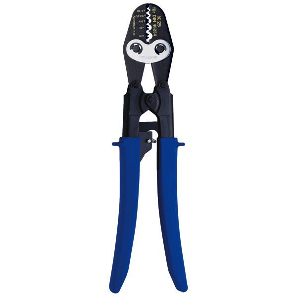 mit Sperrvorrichtung Ideales Presswerkzeug mit federunterstützter Werkzeugöffnung. Für Quetschkabelschuhe DIN 46234, Stiftkabelschuhe DIN 46230. Für Nickel- und Edelstahl-Rohrkabelschuhe und Verbinder bis 6 mm². Mit Sperrvorrichtung für gleichmäßig kontrollierte Pressergebnisse. Exakte Querschnittzuordnung durch daürhafte Markierung auf dem Presswerkzeug.