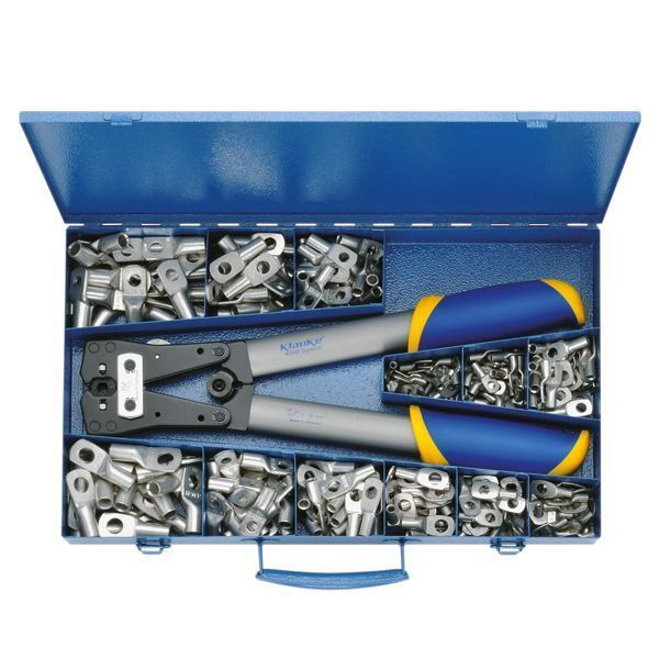 | Kurzbeschreibung | Sortimentskasten aus Stahl mit DIN Presskabelschuhn und Presswerkzeug |