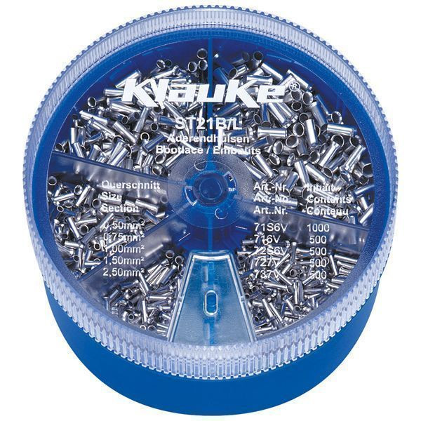 Streudose aus schlagfestem Kunststoff. Stapelbar und wiederverschließbar. Lieferumfang: Streudose (ST21L) 1 Stück, Aderendhülse DIN 46228 Teil 1, 0,5 mm², 6mm Länge, Cu verzinnt (71S6V) 1000 Stück, Aderendhülse DIN 46228 Teil 1, 0,75 mm², 6mm Länge, Cu verzinnt (716V) 500 Stück, Aderendhülse DIN 46228 Teil 1, 1,0 mm², 6mm Länge, Cu verzinnt (72S6V) 500 Stück, Aderendhülse DIN 46228 Teil 1, 1,5 mm², 7mm Länge, Cu verzinnt (727V) 500 Stück, Aderendhülse DIN 46228 Teil 1, 2,5 mm², 7mm Länge, Cu verzinnt (737V) 500 Stück.