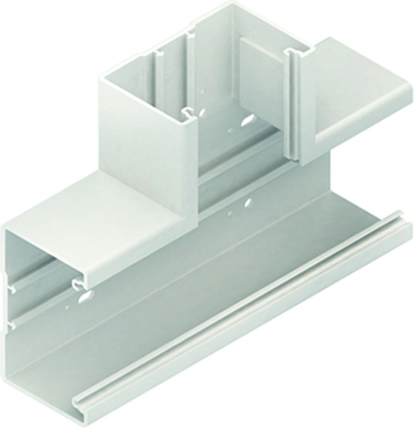 Gerätekanal-T-Stück 90°, einzügig, symmetrisch, mit zwei durchgehenden Aufnahmeprofilen im Rückenteil sowie durchlaufender Perforation im Kanalrücken, einschließlich drei Kanalkupplungen KUV, Stoßstellenverbinder BSV65 zur exakten Verbindung mit dem Kanalunterteil bitte gesondert bestellen. VDE zertifiziert! Abmessungen (ca. Maße) H x T : 105 x 66 mm Haupt- und Abgangsquerschnitt Deckelöffnung : 80 mm Länge in Hauptrichtung : 250 mm Länge in Abgangsrichtung : 165 mm für Gerätekanalunterteil : BU651058... Werkstoff : PVC-hart (Polyvinylchlorid) Farbton : reinweiß RAL : 9010 (ähnlich)