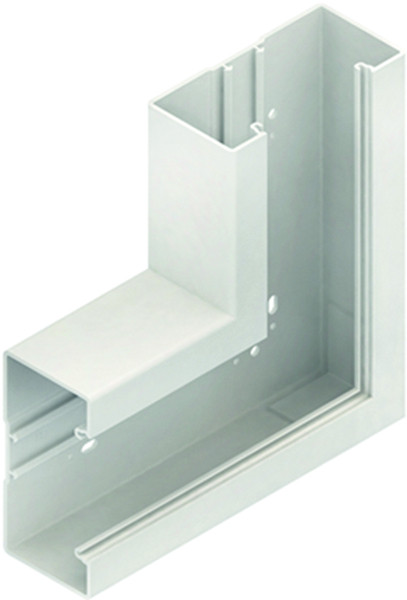 Gerätekanal-Flachwinkel 90°, einzügig, symmetrisch, mit zwei durchgehenden Aufnahmeprofilen im Rückenteil sowie durchlaufender Perforation im Kanalrücken, einschließlich zwei Kanalkupplungen KUV, Stoßstellenverbinder BSV65 zur exakten Verbindung mit dem Kanalunterteil bitte gesondert bestellen. VDE zertifiziert! Abmessungen (ca. Maße) H x T : 105 x 66 mm Deckelöffnung : 80 mm Schenkellänge aussen : 240 mm für Gerätekanalunterteil : BU651058... Werkstoff : PVC-hart (Polyvinylchlorid) Farbton : reinweiß RAL : 9010 (ähnlich)