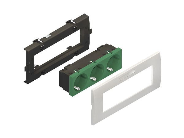 Geräteeinbausystem, vorkonfektioniert, dreifach, waagerecht, anschlußfertig vorverdrahtet, komplett mit Adapter- und Abdeckrahmen, mit Steckdoseneinsatz für Sicherheitsstromversorgung, zum Aufrasten in die Deckelaufnahmekontur der Gerätekanäle BU65... . Empfohlen bei normaler Beanspruchung. Für besondere Beanspruchungen (z.B. Schulen, Werkstätten, Sporthallen) empfehlen wir die Verwendung unserer Geräteeinbaudosen KED... in Verbindung mit einem adäquaten Schalterprogramm. Set besteht aus : 1 x Geräteadapter, dreifach, Modul 45, mit 2 Federclips 1 x Steckdoseneinsatz, dreifach, waagerecht, mit Steckklemmen für Leitungen 1,5 - 2,5 mm², 2-polig, mit Berührungsschutz 1 x Abdeckrahmen, dreifach, Modul 45, einschl. Sichtfenster mit Etikett für Beschriftungsfeld 1 x Montageanleitung. Der Querschnitt ca. 1134 mm² ist vom nutzbaren Querschnitt des Gerätekanals abzuziehen. Abmessungen (ca. Maße) H x B : 83 x 183,5 mm für Deckelöffnung : 80 mm Nennspannung : 250V / 16A Steckdoseneinsatz Farbton : minzgrün RAL : 6029 (ähnlich) Abdeckrahmen Farbton : reinweiß RAL : 9010 (ähnlich)
