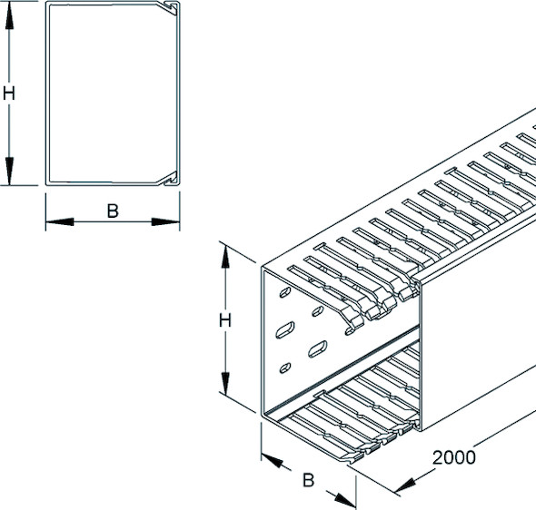 Lieferlänge 2 m Verdrahtungskanal nach DIN EN 50085-2-3, mit Deckel und dreireihiger Befestigungslochung nach ehemals DIN 43659 im Kanalboden, auf der Unterseite mit doppelseitigem Klebeband zur besseren Fixierung versehen, die Stege sind ohne Werkzeug ausbrechbar, halogenhaltig. Abmessungen (ca. Maße) Höhe H x Breite B : 100 x 75 mm Schlitzbreite : 5 mm Stegbreite : 7,5 mm dreireihige Bodenlochung : 6,5 x 14 und 4,5 x 8 mm Bodenlochabstand : 25 mm Reihenabstand : 25 mm Lieferlänge L : 2000 mm Nutzbarer Querschnitt : 7440 mm² Einsatztemperatur : -5° bis 65°C Werkstoff : PVC, hart, halogenhaltig (Polyvinylchlorid-hart) Farbton : steingrau RAL : 7030 (ähnlich)
