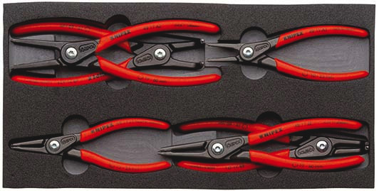 00 20 01 V02 Präzisions-Sicherungsringzangen-Set für Innen- und Außenringe. In Schaumstoffeinlage für Werkbank und Werkstattwagen. Zur übersichtlichen Aufbewahrung der Werkzeuge. Präzise Mulden für die Aufnahme der Zangen. Abmessungen der Schaumstoffeinlage (B x H x T): 335 x 33 x 165 mm. Werkstoff: zweifarbiger, geschlossenporiger Schaumstoff. sechs Präzisions-Sicherungsringzangen in Schaumstoffeinlage. Lieferumfang: 1 x 48 11 J1 KNIPEX Präzisions-Sicherungsringzange für Innenringe in Bohrungen (Ø 12 - 25 mm), 1 x 48 11 J2 KNIPEX Präzisions-Sicherungsringzange für Innenringe in Bohrungen (Ø 19 - 60 mm), 1 x 48 21 J21 KNIPEX Präzisions-Sicherungsringzange für Innenringe in Bohrungen (Ø 19 - 60 mm), 1 x 49 11 A1 KNIPEX Präzisions-Sicherungsringzange für Außenringe auf Wellen (Ø 10 – 25 mm), 1 x 49 11 A2 KNIPEX Präzisions-Sicherungsringzange für Außenringe auf Wellen (Ø 19 – 60 mm), 1 x 49 21 A21 KNIPEX Präzisions-Sicherungsringzange für Außenringe auf Wellen (Ø 19 – 60 mm),