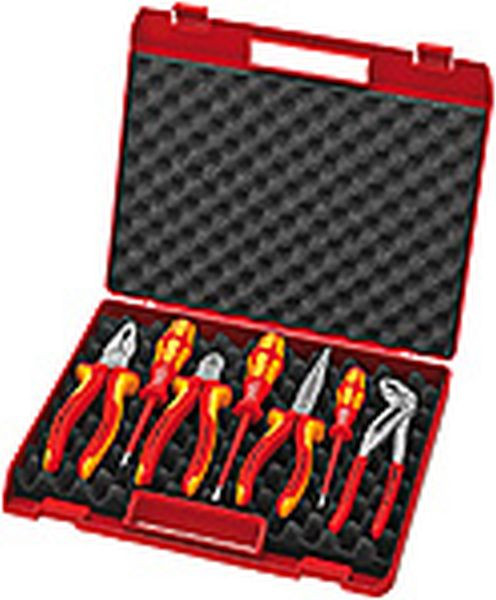 00 21 15 Werkzeug-Box "RED" Elektro Set 2 Hochwertiger und vielseitig verwendbarer, schlagfester Kunststoffkoffer. Schaumstoffeinlage mit Wabenstruktur für variable Bestückung. Abmessungen, außen (B x H x T): 340 x 56 x 275 mm. alle Zangen und Schraubendreher mit Ausnahme der Wasserpumpenzange VDE-geprüft nach DIN EN/IEC 60900. Lieferumfang: 1 x 03 06 180 Knipex Kombizange (180 mm), 1 x 88 03 180 Knipex Alligator® Wasserpumpenzange (180 mm), 1 x 70 06 160 Knipex Seitenschneider (160 mm), 1 x 26 16 200 Knipex Flachrundzange mit Schneide (Storchschnabelzange) (200 mm), 1 x 006100 Wera Schraubendreher für Schlitzschrauben 160 i (0,4 x 2,5 x 80 mm), 1 x 006152 Wera Schraubendreher, Kreuzschlitz Phillips® 162i PH (PH1 x 80 mm), 1 x 006115 Wera Schraubendreher für Schlitzschrauben 160 i (0,8 x 4,0 x 100 mm),