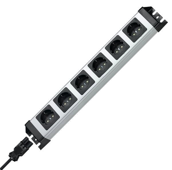 POWERversal 6-fach, Eingang-/Ausgang mit Schnelltecksystem, kaskadierbar, mit 90° gedrehten Töpfen, 65mm Topfabstand, anschraubbar, wiederanschließbar, Steckdosenleiste,250V~, 16A, max. 3600W, Schutzart IP20, Farbe: silber-schwarz