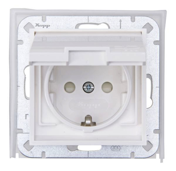Unterputz-Feuchtraum Schutzkontakt-Steckdose mit Klappdeckel und erhöhtem Berührungsschutz, 1-fach, Schutzart IP44, 16A, 250V~, mit Krallen, Farbe: reinweiß