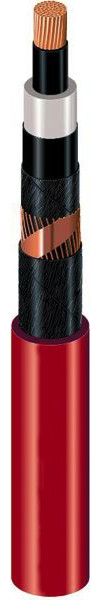 Aufbau: Mehrdrähtiger Kupferleiter, innere Leiterschicht, Aderisolation aus vernetztem Polyethylen (VPE), äußere Leiterschicht, Kupferschirm mit Querleitwendel, PVC-Außenmantel, Farbe: rot