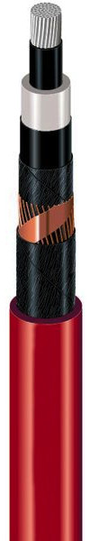 Aufbau: Mehrdrähtiger Aluminiumleiter, innere Leiterschicht, Aderisolation aus vernetztem Polyethylen (VPE), äußere Leiterschicht, Kupferschirm mit Querleitwendel, PVC-Außenmantel, Farbe: rot