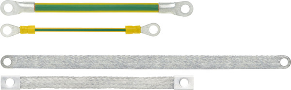 Schaltschrankbau, Die Schutzmassnahme Schutzerdung ist normativ vorgeschrieben, Geerdet werden muessen feste sowie bewegliche metallische Teile, wie Tueren beim Schaltschrankbau etc., Erdungsbaender: - Litze aus blanken Kupferdraehten - Isolation auf PVC Basis - Konfektioniert mit Ringkabelschuhen, Flachband-Erder pressverschweisst: - Litze aus verzinnten Kupferdraehten - Pressverschweisste Enden, Flachband-Erder mit Huelsen: - Litze aus verzinnten Kupferdraehten - Konfektioniert mit aufgepressten Kontakthuelsen, Fixlaengen fuer Schrauben M6 und M8,