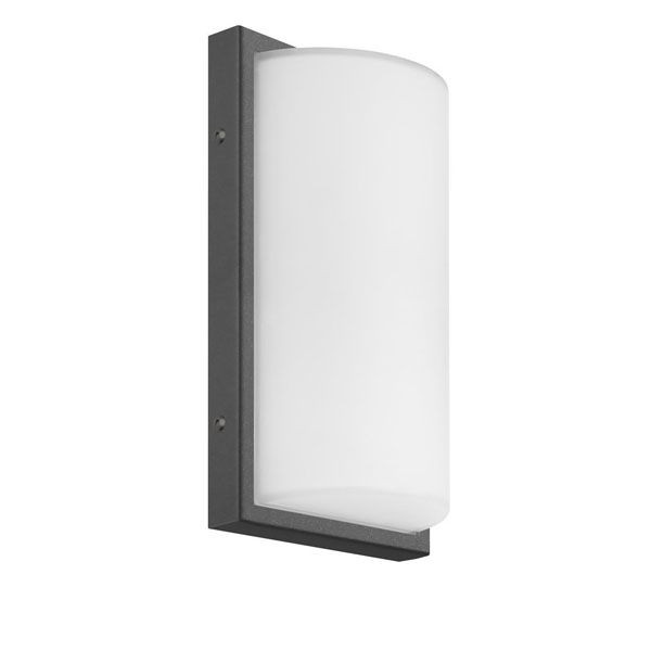 Wandleuchte aus Aluminium-Druckguss, pulverbeschichtete Blende in der Farbe Graphit, Diffusor aus Opalglas, innenliegender Bewegungsmelder ist für LED-Leuchtmittel bis max. 13 W geeignet, Reichweite bis 8m, Fassung E27, IP44