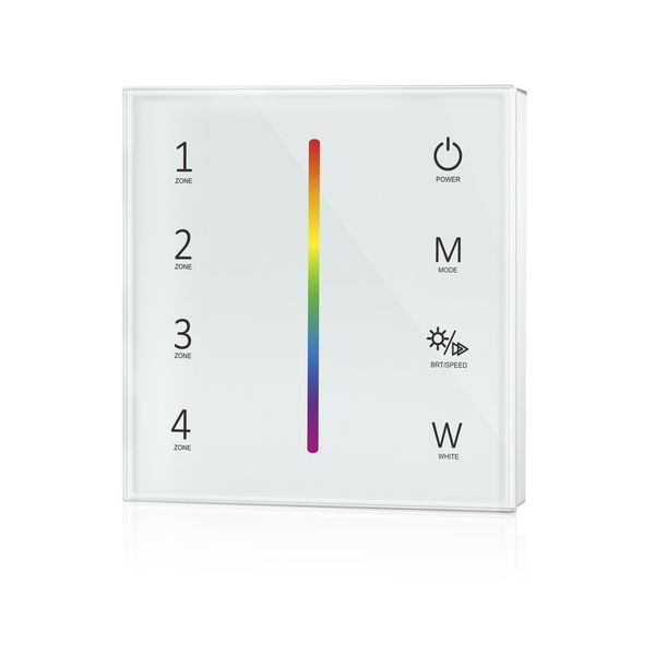 Steuergeräte mit Hochfrequenz-Technologie. Produkteigenschaften: Funk-Wandbedienpanel zur Ansteuerung von RGBW LED Modulen. Ausgangssignal: 2.4 GHz. Eingangsspannung: 100…240 V. Produktvorteile: Ultraempfindliches, hochfestes Glas-Touchpanel mit Touch-Farbschieber in der Mitte und Hintergrundbeleuchtung.. Dimmung der eingestellten Lichtfarben RGB und weiß. 10 vorinstallierte Farbverläufe. Steuerung von bis zu 4 Zonen. Seperate Ansteuerung der Farben Rot, Grün, Blau und Weiß. Einfaches ersetzen an dem Standard Lichtschalter. Anwendungsgebiete: Allgemeinbeleuchtung. Architekturbeleuchtung. Dynamische Effekte in Zonen mit Publikumsverkehr. Voutenbeleuchtung. Hotels. Büros. Wohnräume.