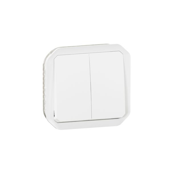 Plexo New Einsatz wahlweise Doppelwechselschalter 10 AX/ Taster 10 A, Steckklemmen (SL), IP 55, IK 08, in der Farbe: Ultraweiß. Einsätze müssen in einem Tragring (Unterputzrahmen ) oder einem Aufputzgehäuse installiert werden.