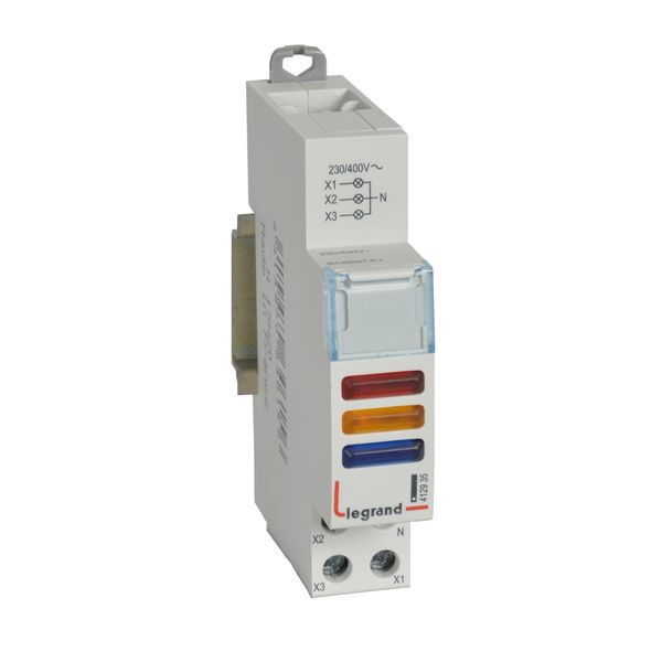 Legrand Meldeleuchten CX3, LED, 3 Phasen-Kontrolle (Rot-Gelb-Blau ), 230/400 VAC, 1-modulig, Befestigung auf Hutprofilschiene EN 60715 durch rastende Schnellbefestigung, mit Beschriftungsfenster, nach EN 60947-5-1.