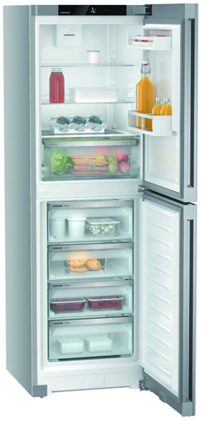 Kühl-Gefrierkombination, Pure-Serie, DuoCooling, EasyFresh, NoFrost. Touch-Elektronik mit digitaler Temperaturanzeige, SuperCool- und SuperFrost-Funktionen. PowerCooling mit FreshAir-Aktivkohlefilter. SteelFinish, vertikale Griffmulden.