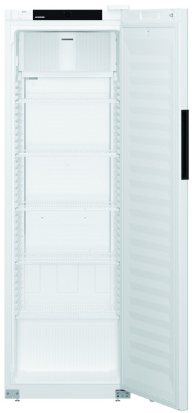 Temperaturanzeige innen analog, dynamische Kühlung, Temperaturbereich +2 bis +9°C, automatische Abtauung, 6 Ablageflächen, davon 5 verstellbare kunststoffbeschichtete Roste mit Auszugsstopp und Begrenzugsstab vorne, Belastbarkeit je Ablagefläche 45 kg, selbstschließende Tür mit Schloss, Türanschlag rechts, wechselbar