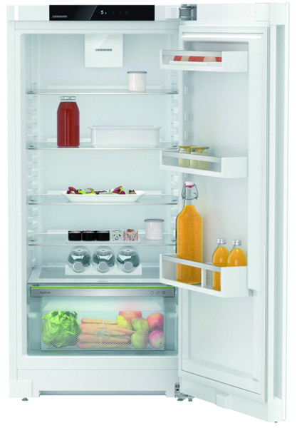 LC-Display monochrom mit Touch-Display, Türalarm optisch und akustisch, Energiesparmodus, SabbathMode, PartyMode, HolidayMode, Displaysperre, SmartDevice-Box nachrüstbar, PowerCooling mit FreshAir-Aktivkohlefilter, SuperCool, LED-Deckenbeleuchtung, 5 GlassLine-Abstellflächen, davon 4 höhenverstellar, Platz für Backblech, 3er Flaschenablage, 1 EasyFresh-Safe auf Laufschienen, Türanschlag rechts, wechselbar