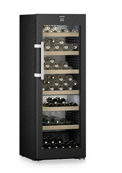 Weinklimaschrank, Vinidor, Isolierglastür mit BlackSteel-Rahmen, UVProtectPlus, Touch & Swipe-Elektronik mit digitaler Temperaturanzeige im 2,4" TFT-Farbdisplay in der Tür, zwei Temperaturzonen, getrennt regelbar zwischen +5°C bis +20°C, SmartDeviceBox integriert, TempProtectPlus, Humidity Select, FreshAir-Aktivkohlefilter, max. 131 Bordeauxflaschen, 7 Ablageflächen, davon 1 Präsentationsbord, LED-Zonenbeleuchtung, VibrateSafe, SoftSystem-Schließdämpfung, Stangengriff mit Öffnungsmechanik.