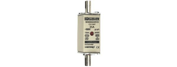 | Kurzbeschreibung | Sicherungseinsatz NH gG Gr.000 AC500V DC250V 35A mit spannungsführenden Grifflaschen sfü und Doppelkennmelder |