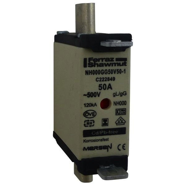 | Kurzbeschreibung | Sicherungseinsatz NH gG Größe 000 AC500V DC250V 50A mit spannungsfreie Grifflaschen SGL und Doppelkennmelder |