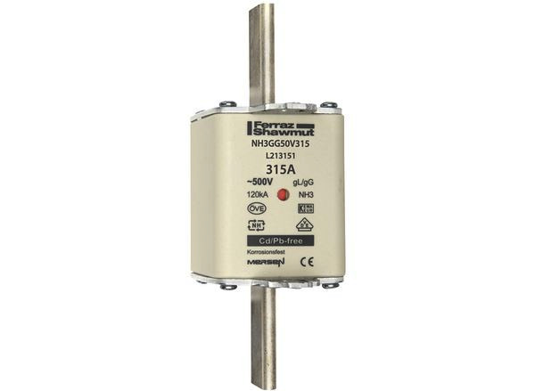 | Kurzbeschreibung | Sicherungseinsatz NH gG Gr.3 AC500V DC250V 315A mit spannungsführenden Grifflaschen sfü und Doppelkennmelder |