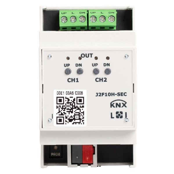 KNX eco+ Jalousie-/Rollladenaktor 2-fach 10A Handbedienung 3 TE Schaltleistung 10A 250 VAC C-Last 140µF