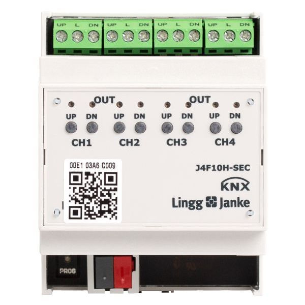 KNX eco+ Jalousie-/Rollladenaktor 4-fach 10A Handbedienung 4 TE Schaltleistung 10A 250 VAC C-Last 140µF