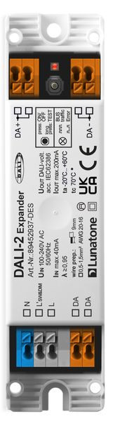 DALI-2 Expander zur einfachen Erweiterung eines DALI-Kreises mit integrierter Busversorgung, Deckeneinbau-Version, ermöglicht die Steuerung von mehreren DALI-Geräten über eine DALI-Adresse, für den übergeordneten DALI-Kreisverhält sich der DALI-2 Expander wie ein DALI EVG (DALI IN) mit einer DALI-Adresse, Ausgang (DALI OUT) mit DALI Stromversorgung (200mA) zum Versorgen von DALI-EVGs und DALI Steuergeräten, alternative Steuermöglichkeit desDALI-Ausgangskreises über den Switch+Dim-Eingang (Broadcast)