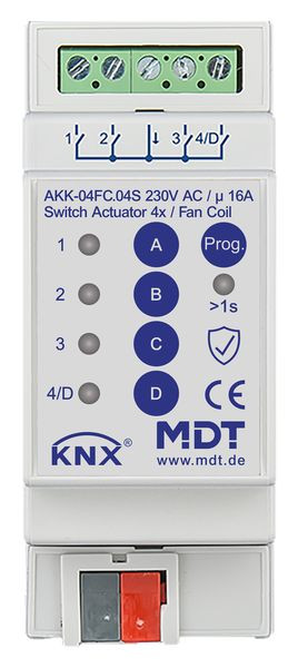 KNX Schaltaktor 4-fach, 2TE REG, 16 A, 230 V AC, Kompakt, 70µF, Fan coil, Secure. Kompakte Ausführung mit bistabilen Relais. Strom max. 16 A bei ohmscher Last, 70 µF / 10 EVG. KNX Data Secure. Betriebsart - Fan coil:. Steuerung von 3/4-stufigen Ventilatoren/Gebläsekonvektoren. Zusätzlicher Schaltausgang bei 3-stufigem Betrieb. Ausgänge gegeneinander verriegelt (Software-Steuerung). Direktbetrieb über drei 1 Bit Objekte oder einzelnes 1 Bit Objekt (+/-). Automatikbetrieb via 1 Byte Stellwert (0-100 %). Einsetzbar für 2-Rohr/4-Rohrsysteme. Ausgangsobjekte zum Ansteuern von Heiz-/Kühlventilen. Tag/Nacht Funktion zum Begrenzen der Lüftungsstufe bei Nacht. Notbetrieb bei Ausfall der Stellgröße. Betriebsart - Schaltaktor:. Schließer- und Öffnerbetrieb. Zeitfunktionen (Ein-/Ausschaltverzögerung). Treppenlichtfunktion mit einstellbarer Vorwarnzeit. Status Rückmeldungen für alle Kanäle (aktiv/passiv). Logische Verknüpfungen, 8 Szenen je Kanal. Zentralfunktionen und Sperrobjekte zur Zwangsführung. Einstellbares Verhalten bei Busspannungsausfall/-wiederkehr. 3 Jahre Produktgarantie.
