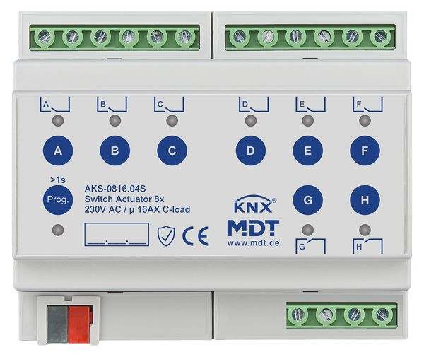 KNX Schaltaktor 8-fach, 6TE REG, 16 A, 230 V AC, C-Last,Standard,140µF, Secure. Standardausführung mit bistabilen Relais Strom max. 16 A, kapazitive Last max. 140 µF. KNX Data Secure. Platzsparend durch optimalen Formfaktor. Virtuelles Interface in der ETS. Bis zu 6 Zentralobjekte mit Statusobjekten. Handbedienung sperrbar und LED Anzeige je Kanal. 4 mm² Anschlussklemmen. Alle L-Anschlüsse getrennt. Status Rückmeldung für alle Kanäle (auch bei manueller Betätigung). Zeitfunktionen (Ein-/Ausschaltverzögerung, Treppenlichtfunktion). Erweiterte Logik und Szenenfunktion je Kanal. Erweiterte Statusfunktionen (invertiert, zyklisch, bei Sperre). Schwellwertschalter (1 Byte/2 Byte/2 Byte float). Betriebsstundenzähler. Priorität/Zwangsführung mit automatischer Rückfallzeit. Versorgungsspannung über KNX-Bus. Umfangreiche Applikation. Schließer- und Öffnerbetrieb. 3 Jahre Produktgarantie.