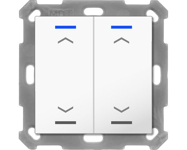 KNX Taster Light 55 2-fach, RGBW, Temperatursensor, Reinweiß glänzend, Jalousie. Ausführung Jalousie mit 2 Tastenpaaren / 4 Tasterflächen und Temperatursensor. Passend für 55 mm Schalterprogramme z. B. MDT Sortiment 55 oder GIRA Standard 55, E2, Event, Esprit oder BERKER S1, B3, B7 oder JUNG A 500, A PLUS, A CREATION, AS 500, A 550, A FLOW oder MERTEN 1M, M-Smart, M-Plan, M-Pure. Die Tasten sind als Tastenpaar oder Einzeltasten frei einstellbar. Ein- und Zweitasterbetrieb für Schalten, Dimmen, Jalousie, Werte. Umschalten von bis zu vier Werten oder Szenen. Kurzer/Langer Tastendruck mit 2 Objekten. Innovative Gruppensteuerung mit langem/extra langem Tastendruck. Mehrfach-Tippfunktion sendet bis zu 4 Werte auf gleiche oder verschiedene Objekte. Zwei RGBW Status-LEDs pro Tastenpaar. LED Helligkeit über Tag/Nacht- oder Helligkeit-Objekt steuerbar. 4 Logikblöcke. Einbau in Schalterdose mit mitgeliefertem Tragring. Integrierter Busankoppler. 3 Jahre Produktgarantie.