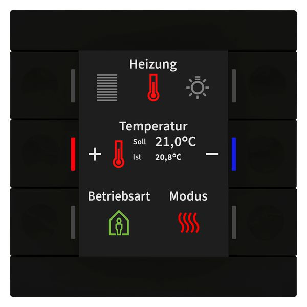 KNX Taster Smart 86 mit Farbdisplay und Temperatursensor, Schwarz matt. Ausführung mit 6 mechanischen Tasten mit Fingermulde, Farbdisplay und RGB-Statusanzeige. Verwendbar als 4/6/8/12-fach Taster. Großes, aktives Farbdisplay zur Funktions- und Statusanzeige. Bis zu 12 Funktionen auf 2 oder 3 Ebenen (2x6 oder 3x4 Funktionen). Bis zu 6 Funktionen ohne Ebenenumschaltung. Mapping Funktion zur einfachen Funktionszuordnung. Patschfunktion mit erweitertem Funktionsumfang. Innovative Gruppensteuerung mit langem/extra langem Tastendruck. Erweiterte Infoanzeige mit bis zu 6 Werten in 3 Zeilen. Die Tasten sind als Tastenpaar oder Einzeltasten frei einstellbar. Einstellbare Symbole und Texte für jede Taste/Funktion. Anzeige von Statusinformationen (1 Bit) und Meldungen (14 Byte). Mit Temperatursensor zur Erfassung der Raumtemperatur. Zusätzliche Funktion zur Einstellung von Temperatur und Betriebsart. Ein- und Zweitasterbetrieb für Schalten, Dimmen, Jalousie, Werte. Kurzer/Langer Tastendruck mit 2 Objekten. RGB Status-LEDs einzeln je Ebene ansteuerbar. Anzeige von Innen-/Außentemperatur und Uhrzeit. Displayhelligkeit automatisch über Lichtsensor und Tag/Nacht-Objekt. Keine zusätzliche Spannungsversorgung erforderlich. Abmessungen (H x B): 86 x 86 mm. Empfohlene Montagehöhe: 1,50 ... 1,60 m (als Bediengerät).