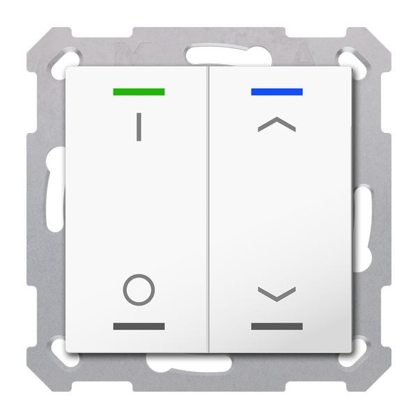 KNX Taster Light 55 2-fach, RGBW, Reinweiß glänzend, Schalten_Jalousie, Secure. Ausführung I/O und Auf/Ab Symbol mit 2 Tastenpaaren / 4 Tasterflächen. KNX Data Secure, integrierter Busankoppler. Passend für 55 mm Schalterprogramme z. B. MDT Sortiment 55 oder GIRA Standard 55, E2, Event, Esprit oder BERKER S1, B3, B7 oder JUNG A 500, A PLUS, A CREATION, AS 500, A 550, A FLOW oder MERTEN 1M, M-Smart, M-Plan, M-Pure. Die Tasten sind als Tastenpaar oder Einzeltasten frei einstellbar. Intelligentes Ein-Tasten-Dimmen. Erweiterte Funktion "Werte senden". Ein- und Zweitasterbetrieb für Schalten, Dimmen, Jalousie, Werte. Umschalten von bis zu vier Werten oder Szenen. Kurzer/Langer Tastendruck mit 2 Objekten. Innovative Gruppensteuerung mit langem/extra langem Tastendruck. Mehrfach-Tippfunktion sendet bis zu 4 Werte auf gleiche oder verschiedene Objekte. Zwei RGBW Status-LEDs pro Tastenpaar. LED Helligkeit über Tag/Nacht- oder Helligkeit-Objekt steuerbar. 4 Logikblöcke. Einbau in Schalterdose mit mitgeliefertem Tragring. 3 Jahre Produktgarantie.