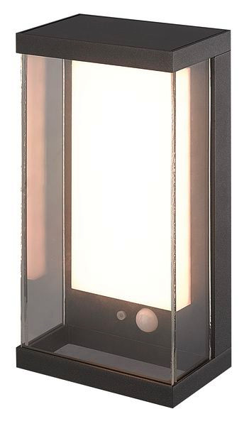 SOLLIA Solar-Wandleuchte in schnörkellos-modernem Stil mit Gehäuse aus anthrazitfarben pulverbeschichtetem Aluminium-Druckguss und Glas (IP54). Langlebige, warmweiße LED-Lichtquellen mit bis zu 80 Lumen. Li-Ion-Akkus im Batteriebecher, ohne Löten wechselbar (Typ 18650, 1200 mAh, 3,7V). Lange Leuchtdauer bis zu 22 Stunden (100%) oder länger (50%). Hohe Funktionalität durch Bewegungssensor und Hell/Dunkel-Erkennung. Drei sensorgesteuerte, praxisgerechte Betriebsarten mit Auto-Dimmfunktion. Knopf zum Initialisieren/Reset und Wechseln der Betriebsarten.