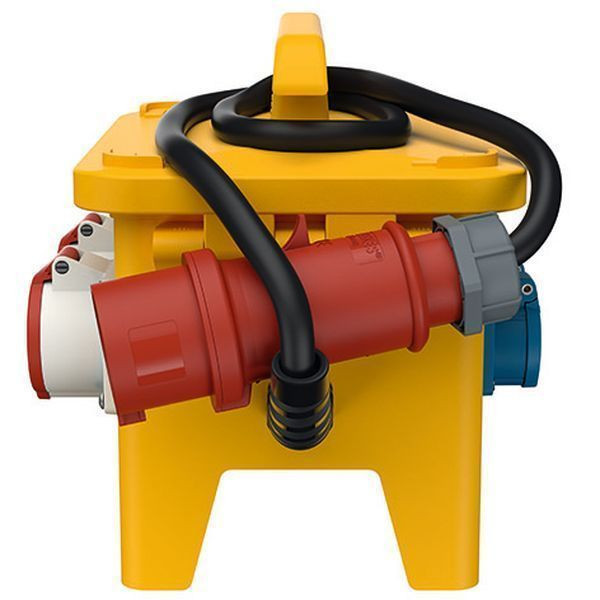 MENNEKES Verteiler EverGUM compact, tragbar anschlussfertig verdrahtet Schutzart IP 44 Gehäuse: 1 Vollgummi-Gehäuse 306x230x288 mm(LxBxH) signalgelb RAL 1003, stapelbar, mit Traggriff Absicherung unter anscharniertem Gehäusedeckel mit Edelstahl-Schnellverschluss, abschließbar Bestückung/Absicherung: Pos.01 2 CEE-Steckdosen 16A 5p 400V 2 LS-Schalter 16A 3p C Pos.02 4 SCHUKO-Steckdosen 16A 2p+E 230V 2 LS-Schalter 16A 1p B Pos.01-02 1 FI-Schutzschalter 40A 4p IFN=0,03A Leitungseinführung/Anschlussmöglichkeit: 1 M 25 mit Verschraubung und Knickschutzspirale Einspeisung: 2m Zuleitung H07RN-F5G4 mit CEE-Stecker 32A 5p 6H 400V