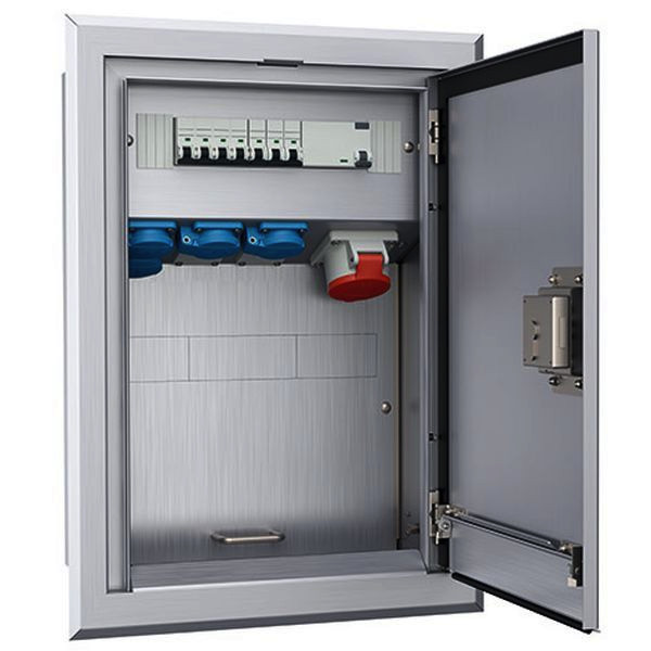 MENNEKES Unterputz-Verteiler Schutzart IP 43 Gehaeuse: 1 Edelstahlgehaeuse, 1.4301 komplett mit Blendrahmen 580x420x210 mm (HxBxT) Einputzkasten 520x360x200 mm (HxBxT) Fronttuere und Blendrahmen: Edelstahl geschliffen,K240 Einputzkasten: Edelstahl blank Bestueckung/Absicherung: Pos.01 1 CEE-Steckdose 16A 5p 400V 1 LS-Schalter 16A 3p C Pos.02 4 SCHUKO-Steckdosen 16A 2p+E 230V 4 LS-Schalter 16A 1p B Pos.01-02 1 FI-Schutzschalter 40A 4p IFN=0,03A Leitungseinfuehrung/Anschlussmoeglichkeit: 3x Leitungseinfuehrungstuelle oben und 2x unten; geeignet fuer Leitungsdurchmesser von 13-43 mm Klemme fuer 2 Leitungen bis 5 x 25 mm² Fronttuer mit Profilhalbzylinder Bei gesteckten Steckern abschliessbar Achtung: Bauseits muss fuer eine ausreichende Abdichtung zwischen Blendrahmen und Wand gesorgt werden.