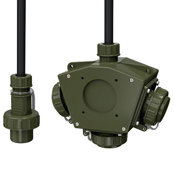 MENNEKES DELTABOX anschlussfertig verdrahtet Schutzart IP68 Gehaeuse: 1 Polycarbonat-Gehaeuse Bronzegruen Bestueckung: Pos.01 3 SCHUKO-Steckdosen 16A 2p+E 230V Zuleitung/Anschlussmoeglichkeit: 1,5m Zuleitung H07RN-F3G2,5 (nach VG 95 218 T 010 002) und SCHUKO-Stecker 16A 2p 230V DWD TM 1 M32x1,5 mit Verschraubung Klemme fuer 1 Leitung bis 5 x 6 mm² mit innenliegender Zugentlastungsschelle und montiertem Aufhaengehaken 1 Aufhaengebuegel (lose)