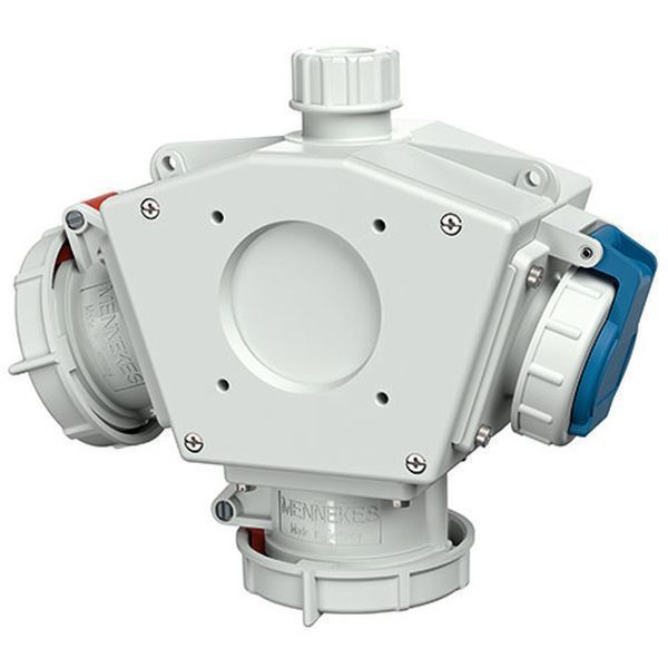 MENNEKES DELTABOX anschlussfertig verdrahtet Schutzart IP 67 Gehäuse: 1 Polycarbonat-Gehäuse elektrograu RAL 7035 Bestückung: Pos.01 2 CEE-Steckdosen 16A 5p 400V ( 228A) - je 1x links und unten - Pos.02 1 SCHUKO-Steckdose 16A 2p+E 230V - rechts - Leitungseinführung/Anschlussmöglichkeit: 1x M32x1,5 mit Verschraubung Klemme für 1 Leitung bis 5 x 6 mm² mit innenliegender Zugentlastungsschelle und montiertem Aufhängehaken 1 Aufhängebügel (lose)