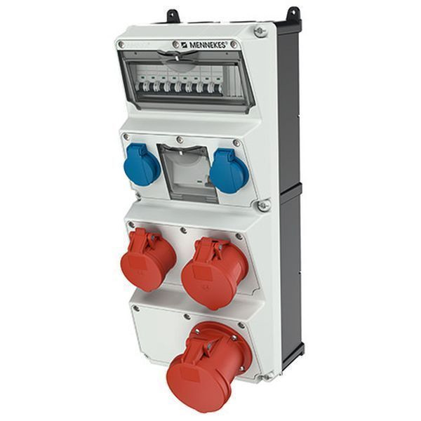 Gehäusegröße: 520 x 225 mm MENNEKES Steckdosen-Kombination AMAXX anschlussfertig verdrahtet Schutzart IP 44 Gehäuse: 1 AMAPLAST-Gehäuse 520x225 mm (HxB) plombierbar, mit Außen- u. Innenbefestigung Unterteil schwarz Oberteil elektrograu RAL 7035 seitlich anscharniert mit Doppelgewinde-Deckelschrauben Absicherung auf vorziehbarer Tragschiene unter transparenter Betätigungsklappe nach unten öffnend und mittels Vorhängeschloss abschließbar Steckdosen mit generell schräger Steckrichtung Bestückung/Absicherung: Pos.01 1 CEE-Steckdose 63A 5p 400V Pos.02 1 CEE-Steckdose 32A 5p 400V 1 LS-Schalter 32A 3p C Pos.03 1 CEE-Steckdose 16A 5p 400V 1 LS-Schalter 16A 3p C Pos.04 2 SCHUKO-Steckdosen 16A 2p+E 230V 2 LS-Schalter 16A 1p C Pos.01-04 1 FI-Schutzschalter 63A 4p IFN=0,03A Leitungseinführung/Anschlussmöglichkeit: je 2 M 40 oben und unten (verschlossen) je 2 M 20 oben und unten (verschlossen) Klemme für 2 Leitungen bis 5 x 25 mm²
