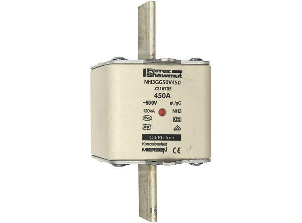 | Kurzbeschreibung | Sicherungseinsatz NH gG Gr.3 AC500V DC250V 450A mit spannungsführenden Grifflaschen sfü und Doppelkennmelder |
