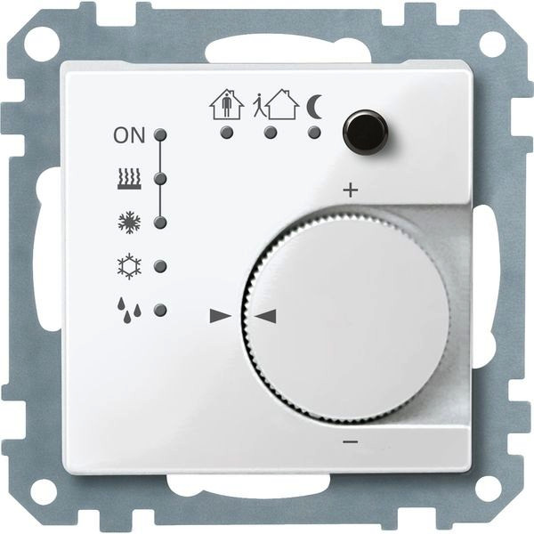 KNX Raumtemperaturregler Unterputz/PI mit Tasterschnittstelle 4fach. Für System M. Das Gerät ist ein Raumtemperaturregler und ein Binäreingang. Abhängig von der Betriebsart, dem aktuellen Temperatursollwert und der Raumtemperatur wird eine Stellgröße für den Heiz- oder Kühlregler auf den KNX übertragen. Die Temperatur kann entweder über den internen oder den externen Temperatursensor erfasst werden, der an die Tasterschnittstelle angeschlossen werden muss. Die Tasterschnittstelle erzeugt eine interne Signalspannung zum Anschluss von max. vier konventionellen Tastern oder potentialfreien Kontakten. Davon können zwei Eingänge für den Anschluss von Schwachstrom-LEDs verwendet werden. Mit integriertem Busankoppler. Der Anschluss an den Bus erfolgt über eine Busanschlussklemme. Funktionen des Raumtemperaturreglers: Reglerart: 2-Punkt-Regelung, stetige PI-Regelung, schaltende PI-Regelung (PWM). Ausgang: stetig im Bereich 0 bis 100% oder schaltend EIN/AUS. Reglerbetrieb: Heizen mit einem Reglerausgang. Kühlen mit einem Reglerausgang. Heizen und Kühlen mit getrennten Reglerausgängen. Heizen und Kühlen mit einem Reglerausgang. 2-stufiges Heizen mit 2 Regelausgängen. 2-stufiges Kühlen mit 2 Regelausgängen. Betriebsarten: Komfort, Komfortverlängerung, Standby, Nachtabsenkung, Frost-/Hitzeschutz. Bedienung: Sollwertverstellung im Bereich mit Stellrad parametrierbar. Anwesenheitstastenfunktionen können parametriert/abgeschaltet werden. Ventilschutz, Reglerdeaktivierung. Funktionen der Tasterschnittstelle: Schalten, Dimmen, Außenjalousie, Wertgeber (Dimmwertgeber, Nebenstelle für Lichtszenen mit/ohne Memory-Funktion, Temperaturwertgeber, Helligkeitswertgeber). Tasterschnittstelle: bis zu 4 Eingänge, davon 2 als Ausgänge nutzbar und einer zum Anschluss des Fernsensors. Ausgangsspannung: 5 V (SELV). Ausgangsstrom: max. 0,8 mA. Max. Kabellänge: Eingänge/Ausgänge max. 5 m, Fernfühler max. 50 m. Material: Thermoplast glänzend. Farbe: polarweiß, glänzend.
