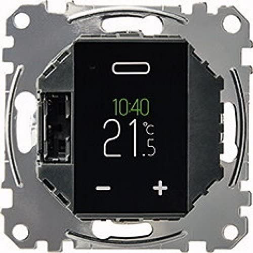 Mit dem programmierbaren Universal Temperaturregler- Einsatz mit Touch-Display kann die Raum- oder Bodentemperatur geregelt werden. Die Bedienung erfolgt über ein Touch-Display. An den Regler können elektrische Fußbodenheizungen, Radiatoren oder Stellantriebe angeschlossen werden. Der Thermostat verfügt über eine Wochenuhr mit individuell einstellbaren Programmen. Alternativ kann zwischen 3 vorprogrammierten Programmen gewählt werden. Es stehen verschiedene Heizmodis zur Verfügung: Comfort-Modus, ECO-Modus und Frostschutz- Modus. Der Thermostat kann in vier verschiedenen Betriebsarten betrieben werden: Raumluft Betrieb: Der interne Temperatursensor erfasst die Raumtemperatur und regelt diese. Fußboden Betrieb: Der als Zubehör erhältliche Fußbodensensor erfasst die Bodentemperatur und regelt die elektrische Fußbodenheizung. Dual Betrieb: Der interne Temperatursensor erfasst die Raumtemperatur und regelt diese. Zugleich überwacht der Fußbodensensor die Bodentemperatur und begrenzt diese auf den voreingestellten Wert der maximalen Temperatur. Diese Betriebsart empfiehlt sich besonders bei temperaturempfindlichen Parkett- oder Laminatfußböden. PWM Betrieb: Die Plusweitenmodulation (PWM) schaltet die Heizung in regelmäßigen Intervallen an und aus. Die gewünschte Temperatur wird über den PWM-Wert eingestellt. Der Fußbodensensor ist in dieser Betriebsart außer Funktion. Die Raumtemperaturgrenzen werden eingehalten. Funktionen: Automatische Sommer-/ Winterzeitumstellung, Ventilschutzfunktion, Betriebsstundenanzeige. Reglerverhalten: PWM oder 2-Punkt, Verhalten Relaisausgang: Öffner/Schließer, Selbstlernende Vorlaufzeiten, Nennspannung: AC 230 V, 50 Hz, Nennlast (Ohmsch): 3680 W, 16 A, Nennlast (Induktiv): 1 A, cos w 0,6. Betriebstemperatur: -10 °C bis +35 °C, Einstellbereich: Raumtemperatur: + 5 °C bis +35 °C, Bodentemperatur: + 5 °C bis +50 °C, Energie-Klasse: IV 2 %. Zu komplettieren mit: Zentralplatte für Universal Temperaturregler-Einsatz mit Touch-Display, System M, System Design, Antik, Zubehör: Fernfühler für Universal Raumtemperaturregler mit Touch-Display.