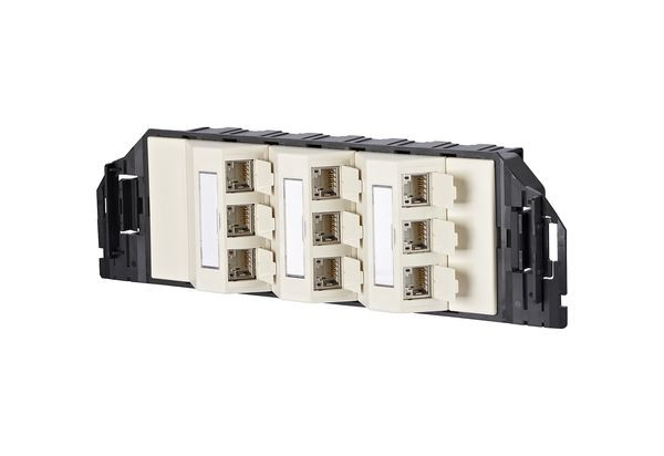 Anschlusseinheit zum Einbau in Geräteeinsätze im Unterflurbereich, passend zu Unterflur-Geräteeinsätzen von OBO Bettermann (Ackermann) und einzelne Typen von :hager (Electraplan Solutions), Bauform GB3, mit C6, Amodul 180° GHMT Cat.6, A re-embedded PVP zertifiziertCat.6, A Komponentenprüfung nach ISO/IEC 11801, DIN EN 50173-1, ANSI/TIA-568.2-D und IEC 60603-7-51, GHMT zertifiziertEinhaltung der Klasse E, A bis 500 MHz nach ISO/IEC 11801, DIN EN 50173-1getestet: Komponente bis 600 MHz, Link bis 800 MHz, für 10GBit Ethernet (IEEE 802.3an), Remote Powering (PoE, PoE plus, UPoE und 4PPoE) und HDBaseT geeignet, Anschluss von Datenleitungen AWG 26/1 - 22/1 (eindrähtig) und AWG 26/7 bis 22/7 (mehrdrähtig) an IDC-Schneidklemmen, Spezialwerkzeug-freie Migration auf 25G-Systeme, inkl. Modulträger, Abdeckkappen und Blindabdeckungen, Steckrichtung der Module 45° nach oben geneigt, mit Sichtfenster für beiliegende Beschriftungseinlage, Beschriftungsbogen 209 x 294 mm siehe Zubehör, integrierte Staubschutzklappen (auch farbig erhältlich), Farbe: Gerätebecher schwarz, Abdeckteile perlweiß, Varianten: 3 Port, 6 Port, 9 Port, 12 Port