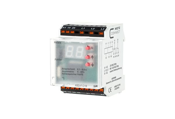 Überwachungsrelais zur Überwachung eines Drehstromanschlusses auf Asymmetrie, Phasenausfall, Phasenfolgefehler sowie Über- und Unterspannung. Mit externer Fehlerquittierung.Anschluss mit Federkraftklemmen (Push-In), Ansprechverzögerung einstellbar, Asymmetrie einstellbar, Fehlerspeicher wählbar, 7-Segment-Anzeigen