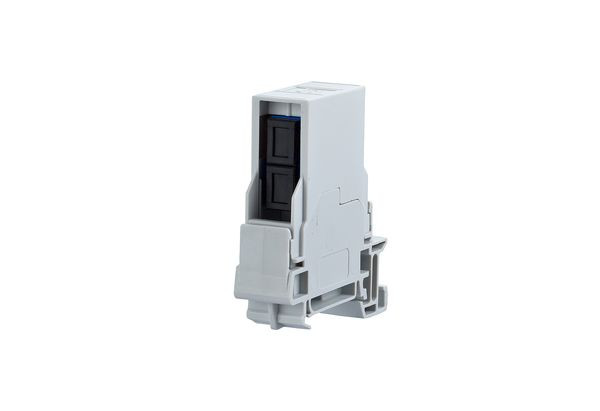 Anschlusseinheit mit SC-D Kupplung auf Tragschiene TH35 nach DIN EN 60715, Führungshülse aus Zirkonoxydkeramik (ZrO2) geschlitzt für Singlemode Anwendungen, Führungshülse aus Metall (Ph-Br) geschlitzt für Multimode Anwendungen, die Baubreite von 1TE ermöglicht den Einbau von bis zu 12 Geräten in einen Standard-Elektroverteiler, Steckrichtung senkrecht, 90° zur Tragschiene, Varianten: SM, MM